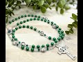 Stunning 6mm Eden Green Swarovski Pearls make up the Hail Mary beads, and 10mm silver toned Shamrock beads act as the separation between decades.
